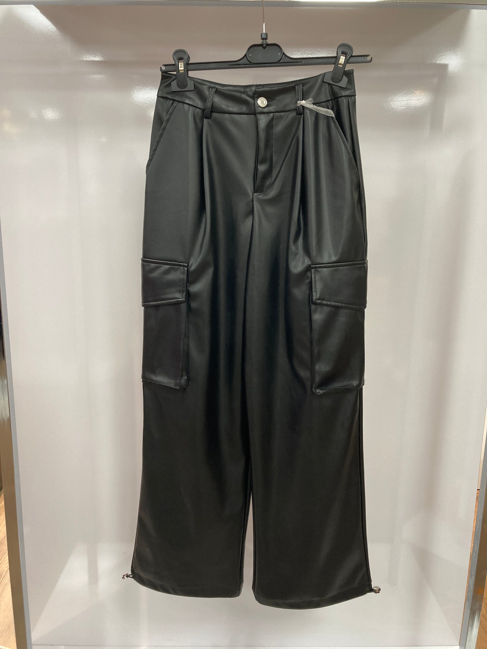 Moderne Cargohose aus strapazierfähigem Kunstleder in klassischem Schwarz. Die vielseitigen Cargo-Taschen bieten praktischen Stauraum für alltägliche Gegenstände, während das pflegeleichte Kunstleder eine einfache Reinigung und Langlebigkeit gewährleistet. Perfekt für einen urbanen, funktionalen Look mit zeitlosem Appeal – kombinierbar zu verschiedenen Outfits und Anlässen.